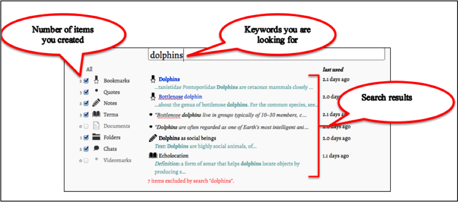 Search helps you find items you created on nStudy, items such as;